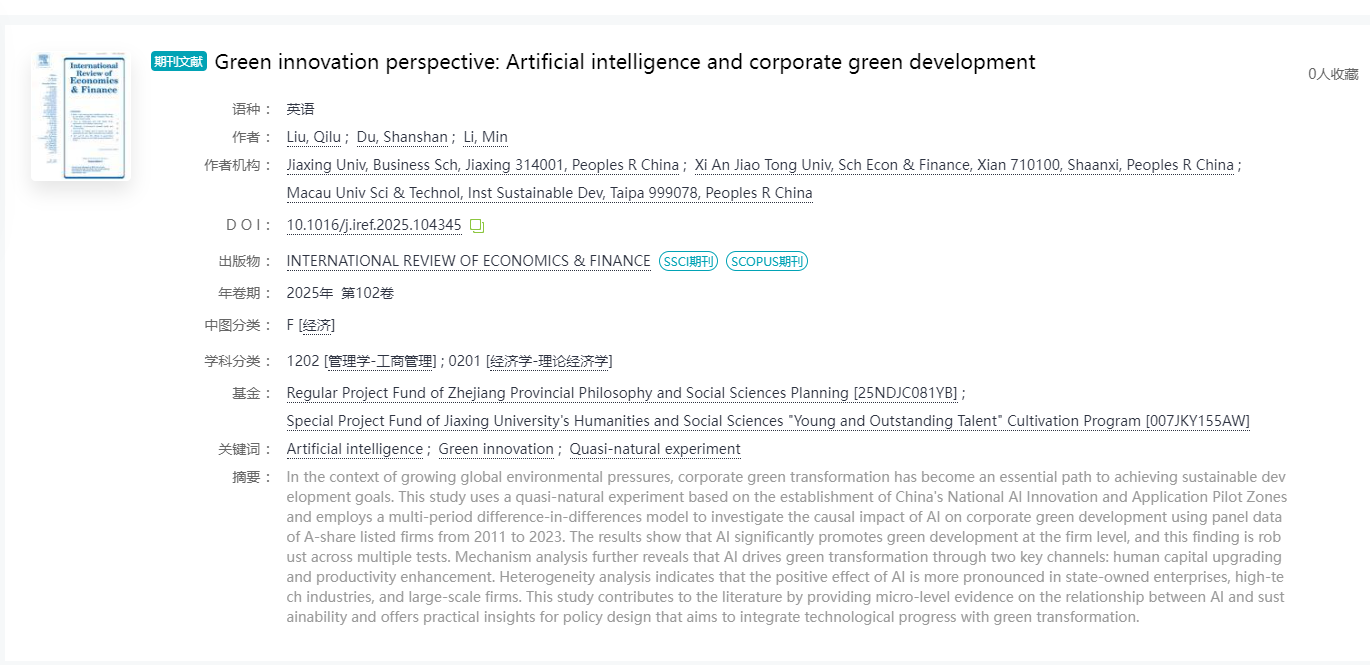 近日,我校商学院刘琦璐老师International Review of Economics and Finance》(中科院二区,影响因子5.6)上发表了题为Green innovation perspective: Artificial intelligence and corporate green development的研究论文。刘琦璐老师为论文第一作者,嘉兴大学商学院为论文第一作者单位。