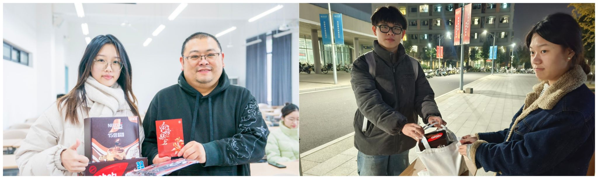 慰问现场,李勇院长、虞岚书记一行走进考研教室,向奋战在备考一线的学子们送上暖心礼包。礼包内精心搭配了考研文具、提神咖啡、能量饼干及定制祝福卡片,每一份物资都承载着学院的深切关怀。“坚持就是胜利,我们永远支持你!” 李勇院长的亲切寄语直抵人心,为学子们注入强劲动力;虞岚书记与学子们面对面深入交流,细致询问备考进度、生活需求及面临的实际困难,耐心为大家排忧解难,鼓励学子们以坚定信念和良好心态迎接挑战。