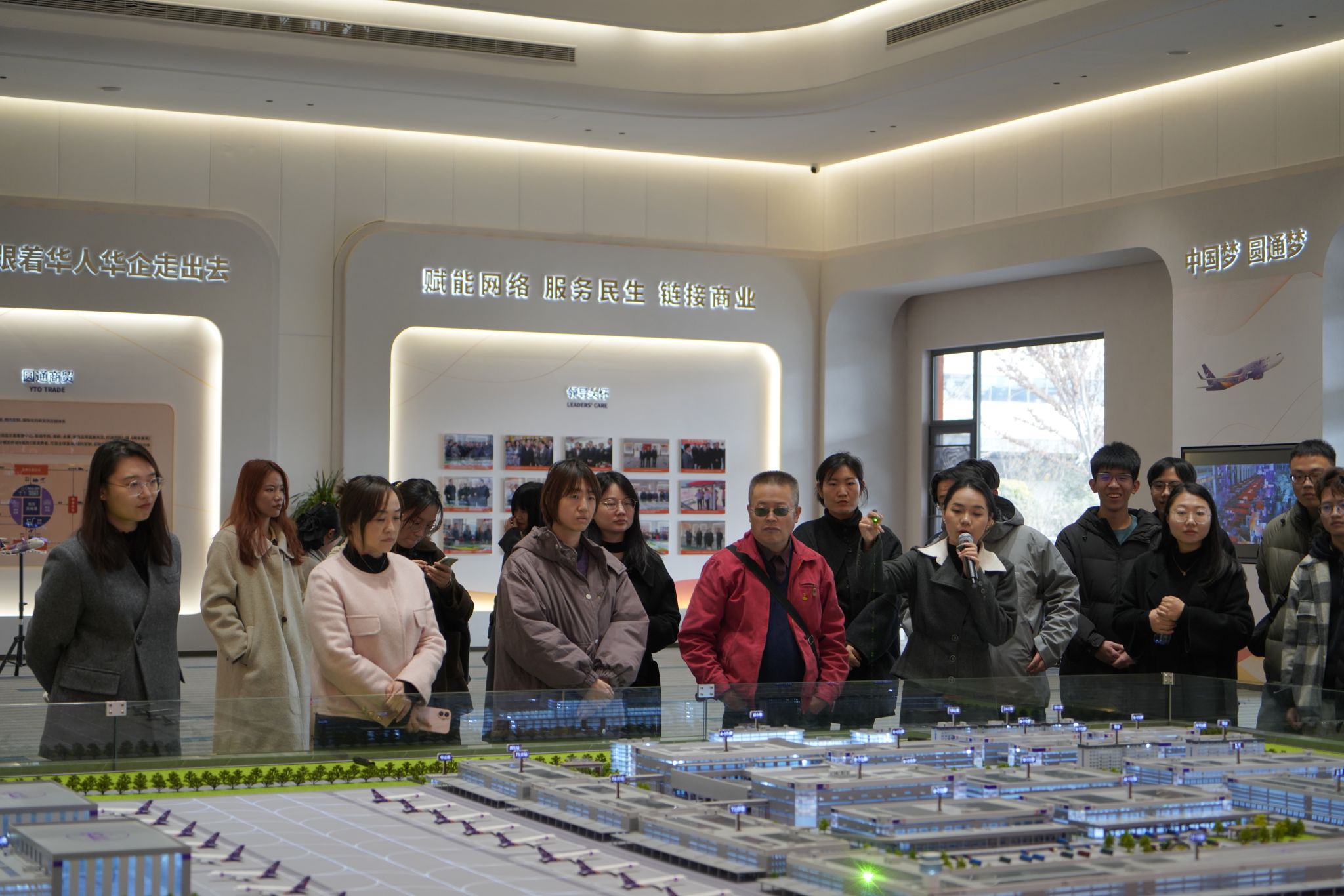 随后,大家前往圆通 “东方天地港” 项目现场,认真聆听关于建设进展、功能分区及产业发展全景的详细介绍。据悉,该项目一期占地面积达 1500 亩,规划机位 100 个,建成后预计年货邮吞吐量将达 240 万吨,目前货站区、保税物流中心、多式联运区等七大核心功能区已初具规模。现场负责人介绍,当前项目已进入施工收尾与设备调试的关键阶段,各单体建筑正全力以赴冲刺交付目标,力争早日发挥航空物流枢纽作用。党员们驻足于项目沙盘前,直观感受 “红船启航地” 的地理优势如何转化为辐射全球的物流枢纽势能,真切体会到新时代 “开天辟地、敢为人先” 的红船精神,在高质量发展浪潮中被赋予的鲜活时代内涵与生动实践诠释。