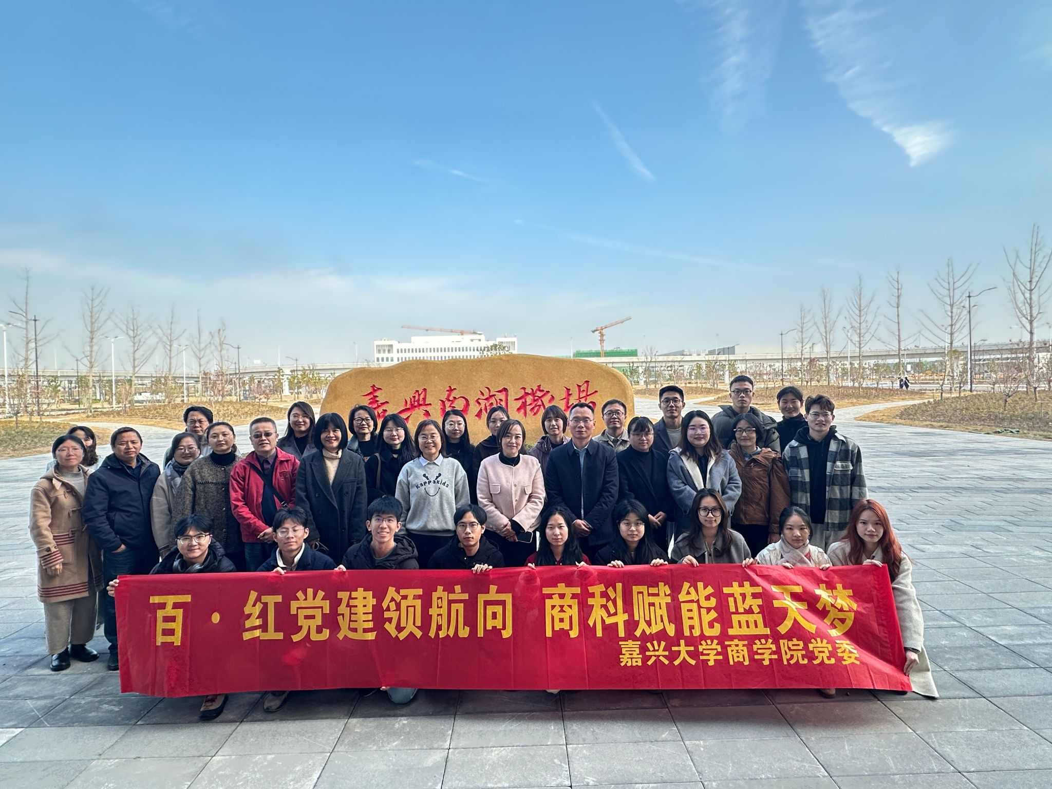 12 月 12 日上午,商学院党委组织师生党员代表并特别邀请民主党派代表共同赴嘉兴南湖机场及圆通 “东方天地港” 项目现场开展主题党日活动,近距离见证机场项目通航前的冲刺备战状态,沉浸式感受重大项目建设的奋进脉搏。