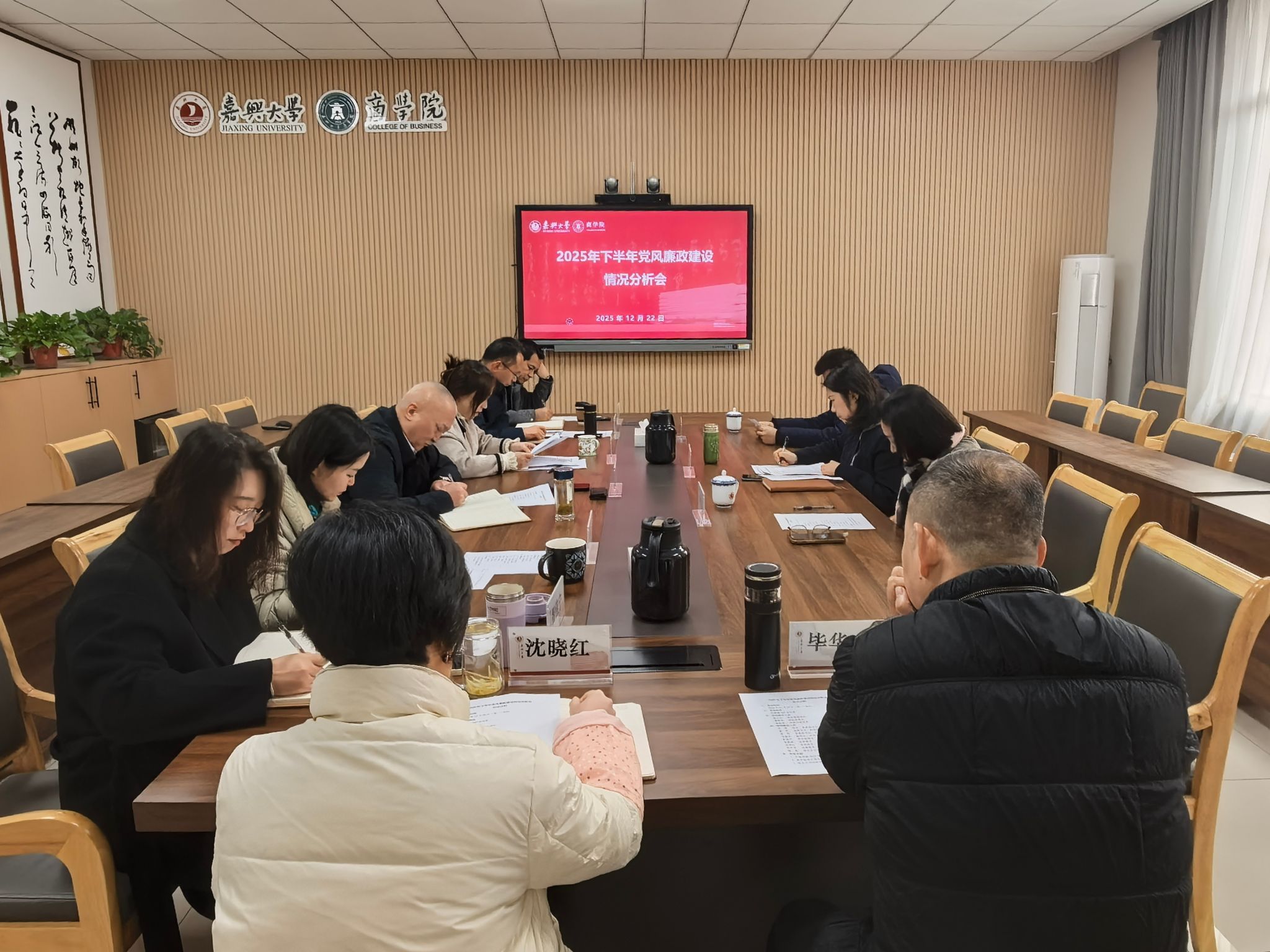 12月22日上午,商学院召开2025年下半年党风廉政建设分析会。校党委副书记陈立力、校纪委委员潘煜双到会指导,会议由学院党委书记虞岚主持,学院全体党委成员、学术副院长、特约监察员参加。