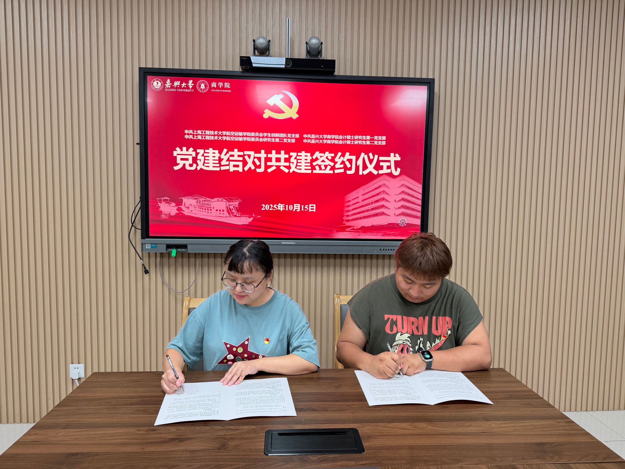 贯彻落实党的教育方针,加强党性教育和红色文化传承,推动基层党组织建设,10月15日下午,嘉兴大学商学院会计硕士研究生第一、第二党支部上海工程技术大学航空运输学院委员会学生创新团队党支部、研究生第二党支部与成功签署党建联建协议。