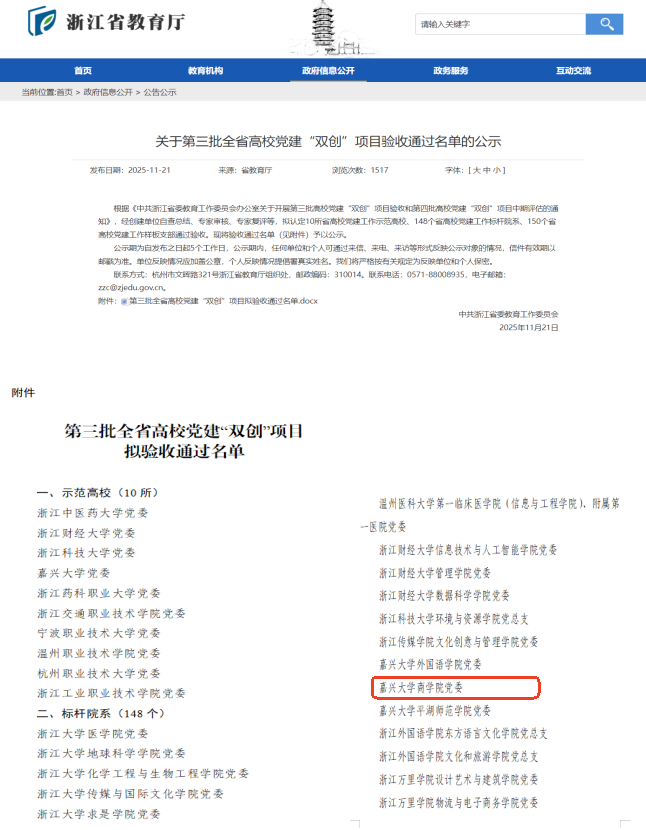 近日,浙江省教育厅发布《关于第三批全省高校党建“双创”项目验收通过名单的公示》,学院党委经过2年的培育创建,凭借扎实的建设成效顺利通过验收,获评“浙江省高校党建工作标杆院系”。
